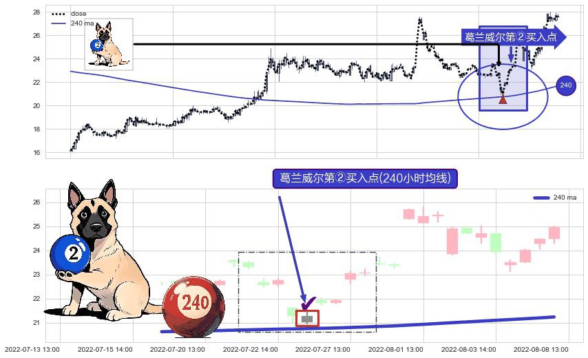 形态多维评估: ⚀ 2022-07-25 14:00:00-小时显现 葛兰威尔均线 240小时均线 第②买入点 上升趋势的中继信号,后市看涨,买进信号
