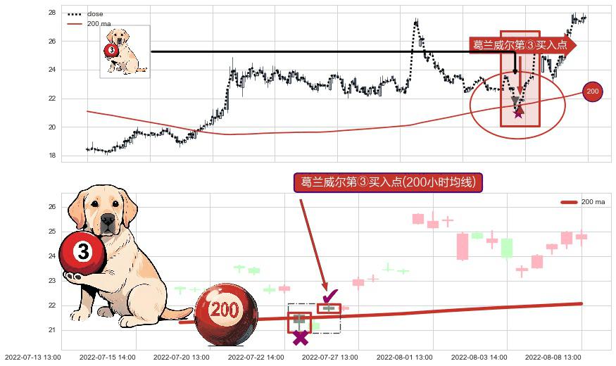 形态多维评估: ⚀ 2022-07-26 13:00:00-小时显现 葛兰威尔均线 200小时均线 第③买入点 上升趋势的中继信号,后市看涨,买进信号