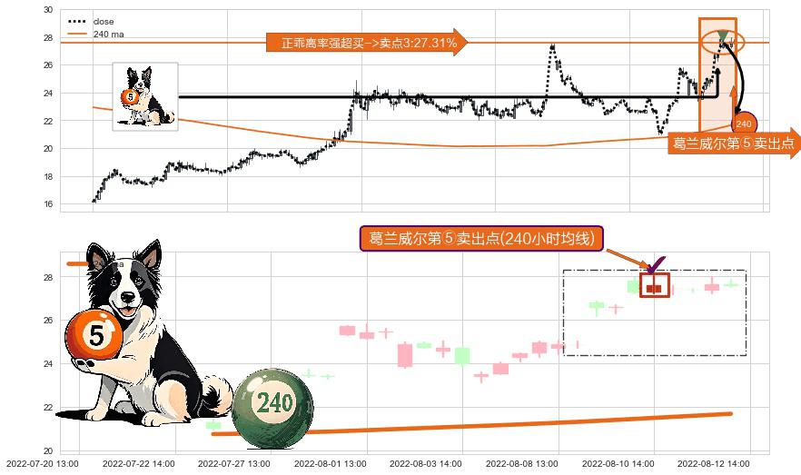 形态多维评估: ⚀ 2022-08-10 14:00:00-小时显现 葛兰威尔均线 240小时均线 第⑤卖出点 上升趋势均值回复的短线回落信号,后市看跌,卖出信号