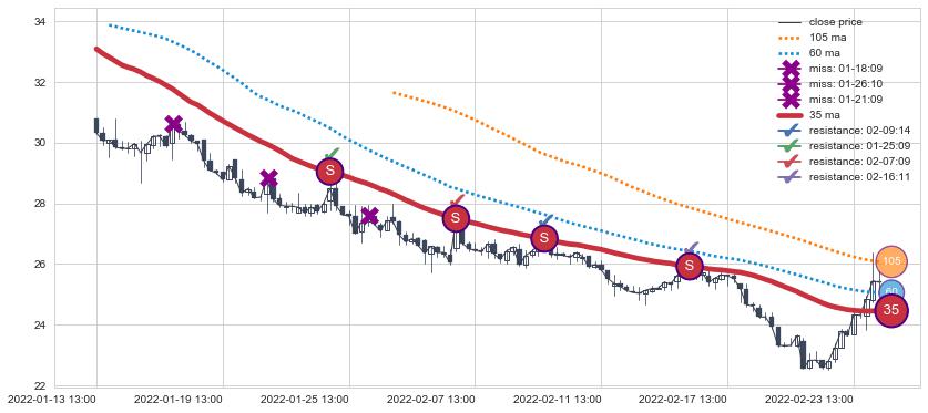 下跌趋势01-13 13:00-02-24 11:00,均线35确认关键阻力4处