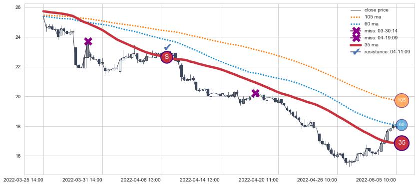 下跌趋势03-25 14:00-05-05 10:00,均线35确认关键阻力1处