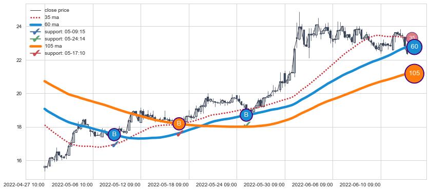 上涨趋势04-27 10:00-06-14 10:00,均线105, 60确认关键支撑3处