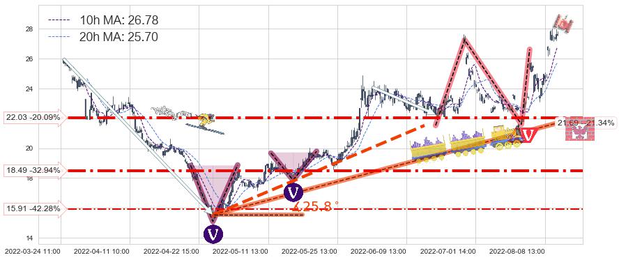 从2022-04-26 14:00至2022-08-12 14:00,共包含250个小时,阶段股价上涨62.14%,阶段股价变动位移路程比: 1 : 5,上涨趋势角度: 25.8,2022-06-24 13:00向⇪形成缺口,跳空上涨+10.01%