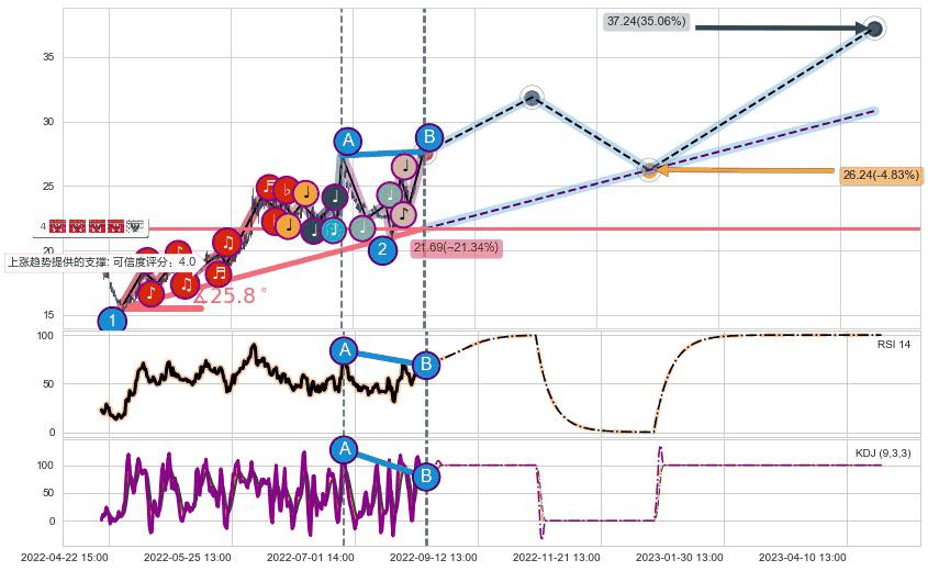 ♘ 在最后的上升阶段2022-04-26 14:00至2022-08-12 14:00存在 持续未破位的支撑位 ,支撑价格21.69,支撑可信任强度81.98%,其距离最后价格27.57相差 -21.34%
