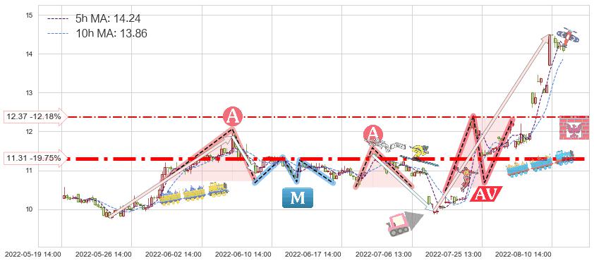 从2022-07-12 13:00至2022-08-12 14:00,共包含47个小时,阶段股价上涨36.86%,阶段股价变动位移路程比: 1 : 2,2022-07-20 13:00向⇪形成缺口,跳空上涨+10.02%
