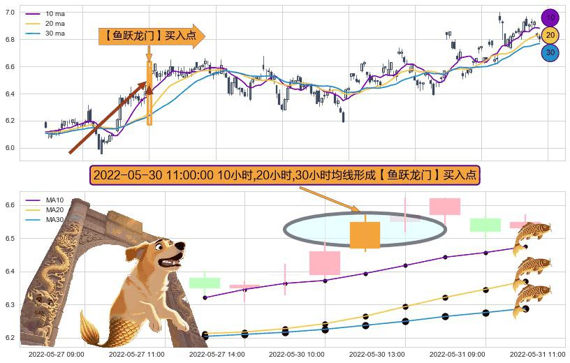形态多维评估: ⚀ 2022-05-30 11:00:00小时显现 10小时-20小时-30小时均线 【鱼跃龙门】买入点 看多信号,后市看涨,买入