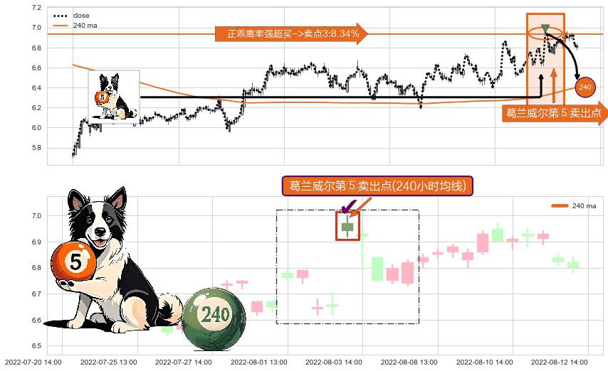 形态多维评估: ⚀ 2022-08-03 13:00:00-小时显现 葛兰威尔均线 240小时均线 第⑤卖出点 上升趋势均值回复的短线回落信号,后市看跌,卖出信号