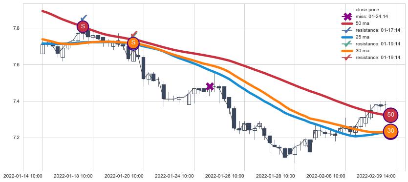 下跌趋势01-14 10:00-02-09 14:00,均线25, 50, 30确认关键阻力2处