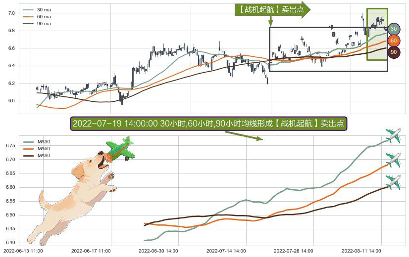 形态多维评估: ⚀ 2022-06-23 14:00:00小时-2022-08-12 14:00:00小时显现 30小时-60小时-90小时均线 【战机起航】卖出点 看空信号,后市看跌,卖出