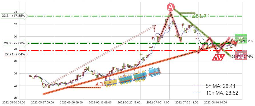 ♘ 阻力价格位28.88,可信任强度76.51%,距离最后交易2022-08-12 14:00形成的收盘价格28.29相差 +2.08%