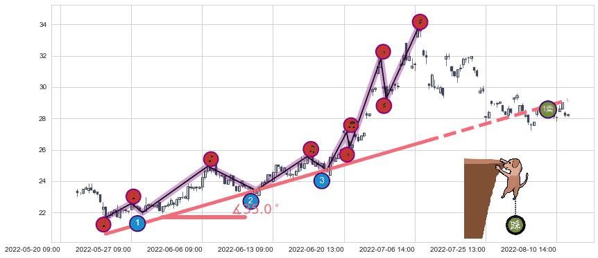 从2022-05-25 10:00至2022-07-08 14:00,共包含114个小时,阶段股价上涨40.53%,阶段股价变动位移路程比: 1 : 3,上涨趋势角度: 35.0