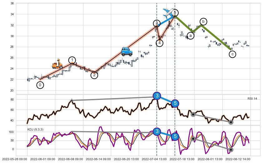 ➣ a,c调整浪MACD, RSI, KDJ走势都【未出现】背离,abc走势延续, 5浪反转概率增强