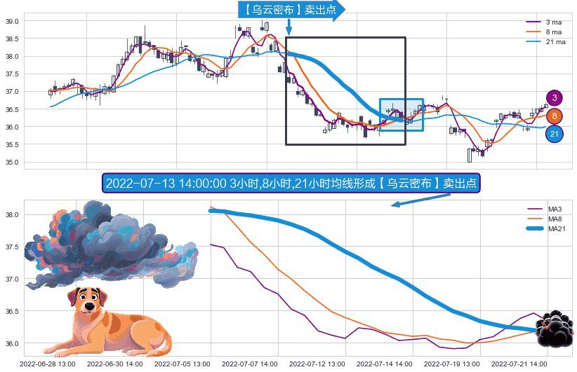形态多维评估: ⚀ 2022-07-05 13:00:00小时-2022-07-21 14:00:00小时显现 3小时-8小时-21小时均线 【乌云密布】卖出点 看空信号,后市看跌,卖出