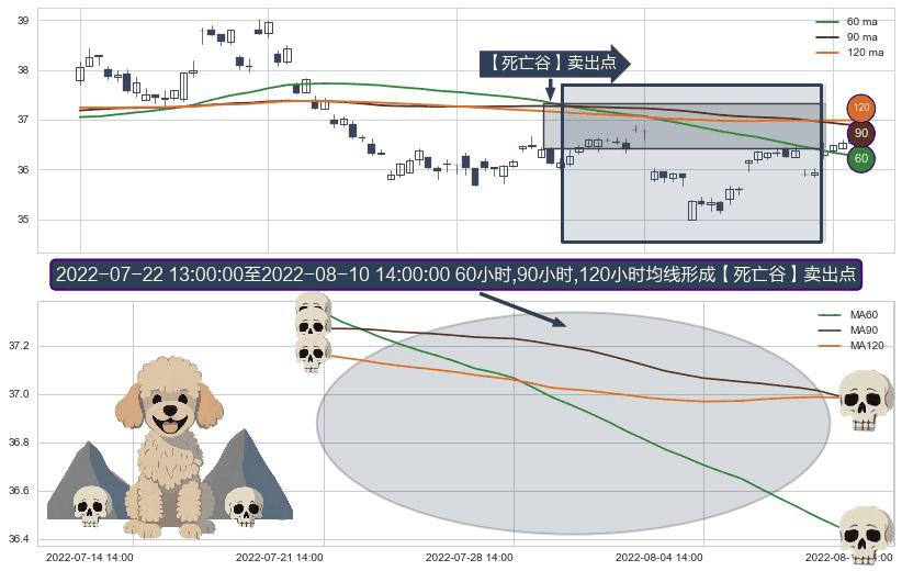 形态多维评估: ⚀ 2022-07-22 14:00:00-小时至2022-08-10 14:00:00-小时显现 60小时-90小时-120小时均线 【死亡谷】卖出点 看空信号,后市看跌,卖出