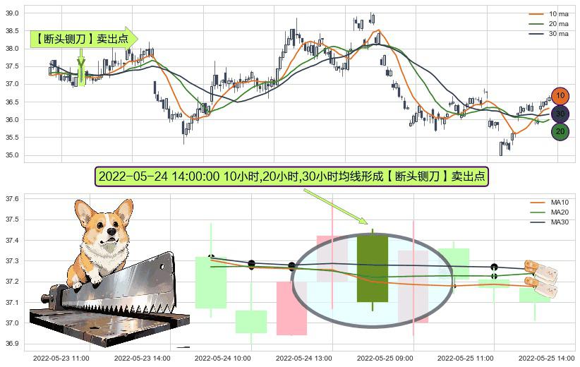 形态多维评估: ⚀ 2022-05-24 14:00:00小时显现 10小时-20小时-30小时均线 【断头铡刀】卖出点 看空信号,后市看跌,卖出