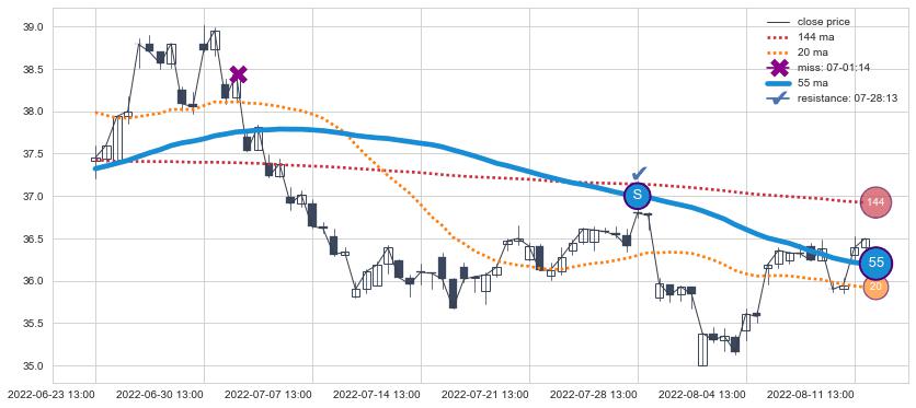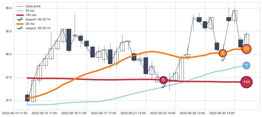上涨趋势06-14 11:00-07-01 14:00,均线144, 20确认关键支撑2处