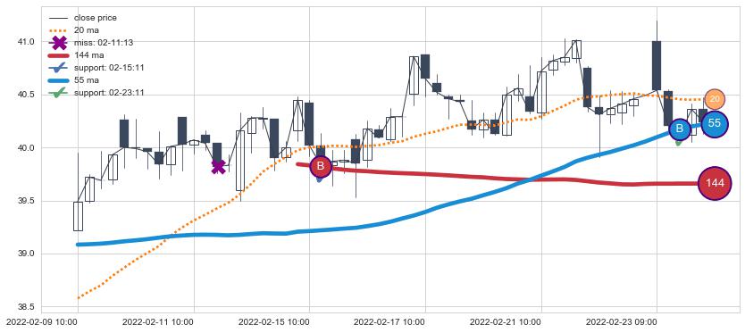 上涨趋势02-09 10:00-02-23 14:00,均线144, 55确认关键支撑2处