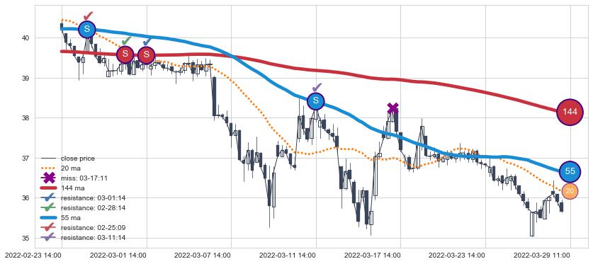 下跌趋势02-23 14:00-03-29 11:00,均线144, 55确认关键阻力4处