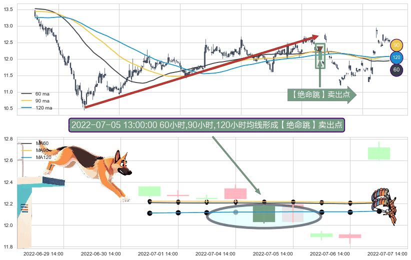 ⚀ 2022-07-05 13:00:00小时显现 60小时-90小时-120小时均线 【绝命跳】卖出点 看空信号,后市看跌,卖出