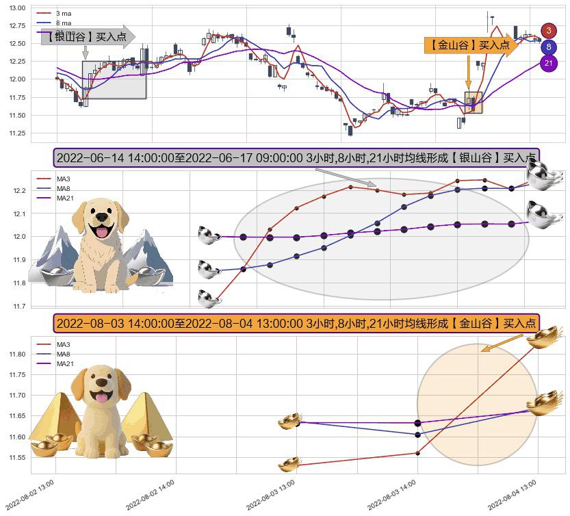 ⚃ 2022-08-04 13:00:00-小时至2022-08-04 13:00:00-小时显现 3小时-8小时-21小时均线 【金山谷】买入点 其再次确认了买入信号,可靠性更强,买入