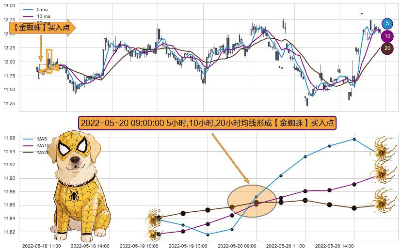 ⚀ 2022-05-20 09:00:00小时显现 5小时-10小时-20小时均线 【金蜘蛛】买入点 看多信号,后市看涨,买入