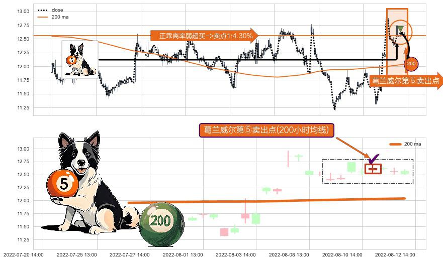 ⚀ 2022-08-11 13:00:00-小时显现 葛兰威尔均线 200小时均线 第⑤卖出点 上升趋势均值回复的短线回落信号,后市看跌,卖出信号