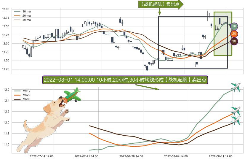 ⚀ 2022-07-20 14:00:00小时-2022-08-11 14:00:00小时显现 10小时-20小时-30小时均线 【战机起航】卖出点 看空信号,后市看跌,卖出