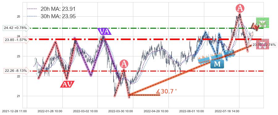 ♞ 20小时均线:23.91,30小时均线:23.95→ 快线<慢线