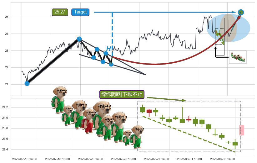 | 8 🅚:吊颈线(上吊线) ➕ 📐:降楔型猜想预期上涨目标target即将达成,随后猜想强阻力来临,预期回调下跌(均值回复) ☞ 看空信号 ⇥ 【🅚线】交织【图形】⇥ 综合量化分数: 48 | > |