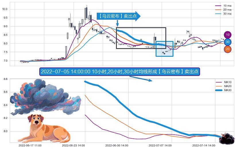 ⚀ 2022-06-23 14:00:00小时-2022-07-15 14:00:00小时显现 10小时-20小时-30小时均线 【乌云密布】卖出点 看空信号,后市看跌,卖出