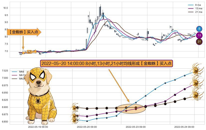 ⚀ 2022-05-20 14:00:00小时显现 8小时-13小时-21小时均线 【金蜘蛛】买入点 看多信号,后市看涨,买入