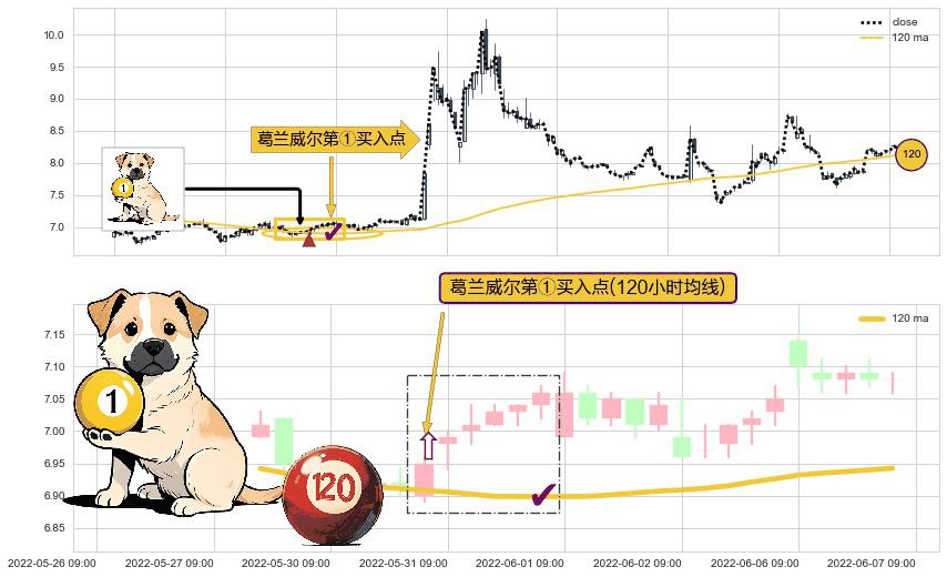 ⚀ 2022-05-30 14:00:00-小时显现 葛兰威尔均线 120小时均线 第买①入点 走势反转见底信号,后市看涨,买进信号