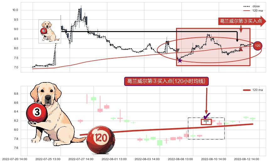 ⚀ 2022-08-09 13:00:00-小时显现 葛兰威尔均线 120小时均线 第③买入点 上升趋势的中继信号,后市看涨,买进信号