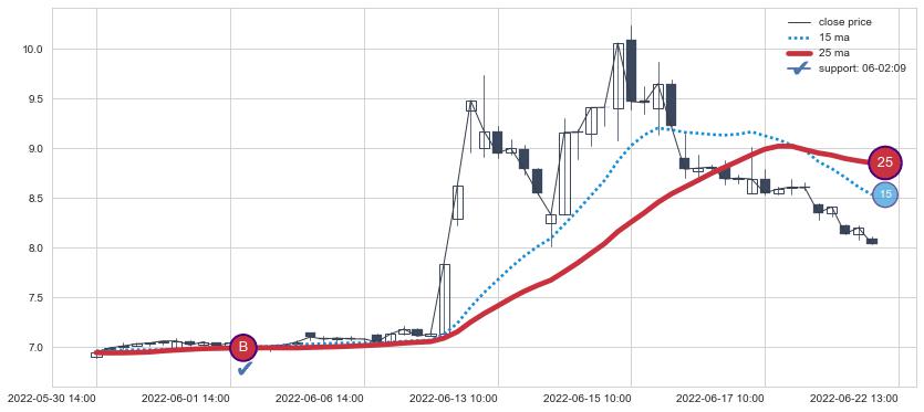 ⚂ 2022-07-15 13:00:00-小时均线向下破位,2022-08-09 13:00:00-小时重新上穿突破均线,均线支撑再次生效