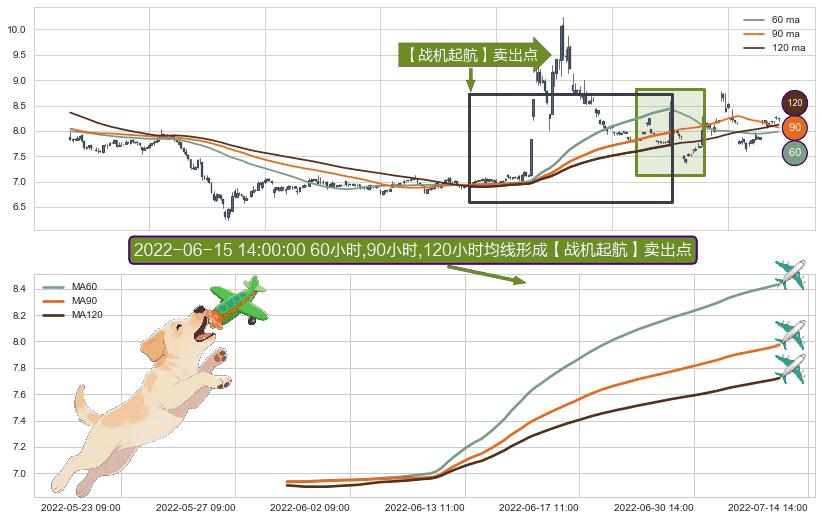 ⚀ 2022-05-30 14:00:00小时-2022-07-12 13:00:00小时显现 60小时-90小时-120小时均线 【战机起航】卖出点 看空信号,后市看跌,卖出