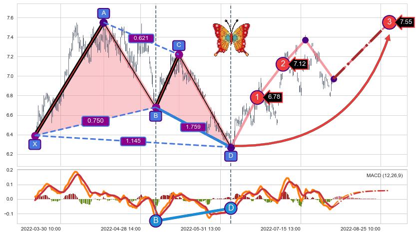 ➢ 距离预测D点位置有足够的上涨空间, 与看跌【蝴蝶】形态相反,实际方向【看涨】