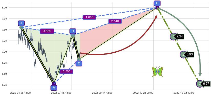 ➣ 未完成【蝴蝶】形态起点X: 04-15:14, 已到达C点: 08-10:13, 预测最终D点: 10-27:14, 共666交易小时