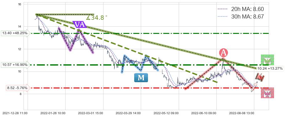 ♘ 阻力价格位10.57,可信任强度80.97%,距离最后交易2022-08-12 14:00形成的收盘价格9.04相差 +16.90%