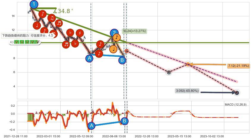♘ 在最后的下跌阶段2022-01-05 09:00至2022-08-11 14:00,存在 持续未破位的阻力位 ,阻力价格10.24,可信任强度87.86%,其距离最后价格9.04相差 +13.27%