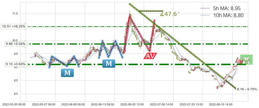 ♘ 阻力价格位9.86,可信任强度76.92%,距离最后交易2022-08-12 14:00形成的收盘价格9.04相差 +9.02%