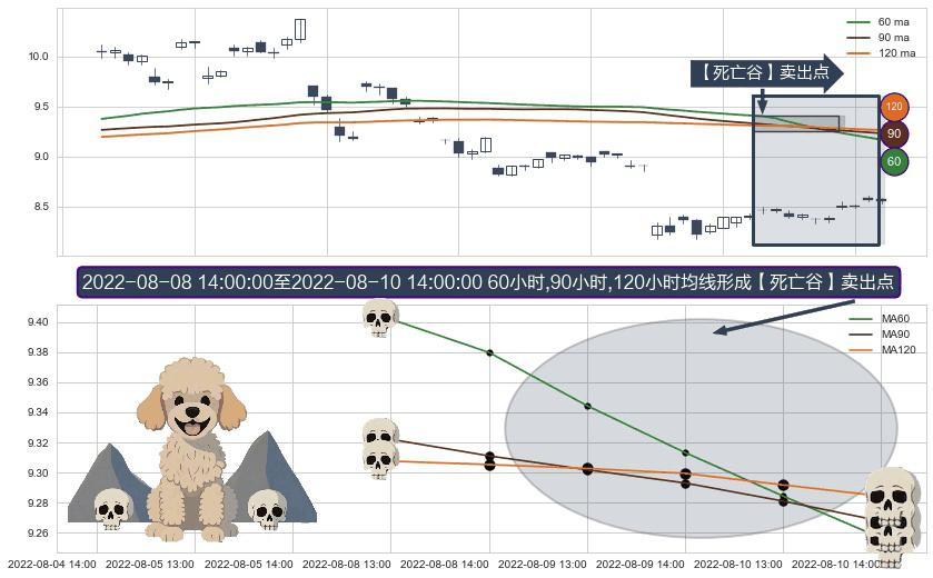 ⚀ 2022-08-09 13:00:00-小时至2022-08-10 14:00:00-小时显现 60小时-90小时-120小时均线 【死亡谷】卖出点 看空信号,后市看跌,卖出