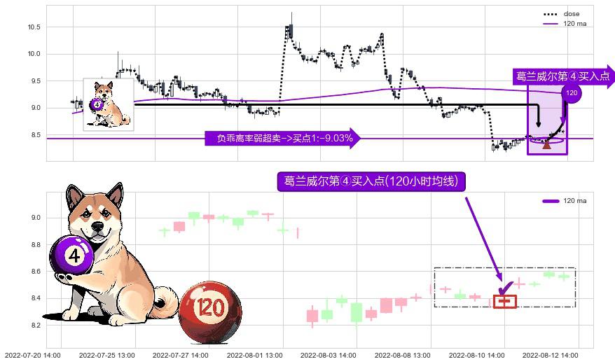 ⚀ 2022-08-10 14:00:00-小时显现 葛兰威尔均线 120小时均线 第④买入点 下降趋势均值回复的短线反弹信号,后市看涨,买进信号