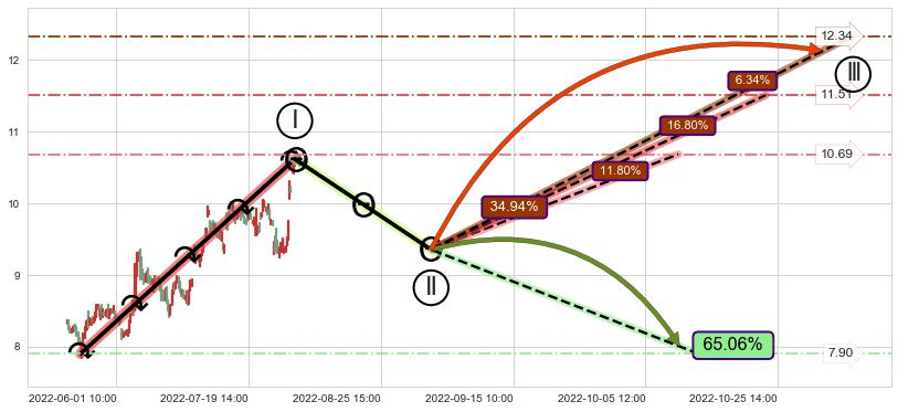 从2022-06-02 10:00至2022-06-20 13:00,共包含54个小时,阶段股价上涨19.34%,阶段股价变动位移路程比: 1 : 2