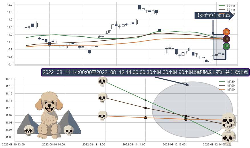 ⚀ 2022-08-12 13:00:00-小时至2022-08-12 14:00:00-小时显现 30小时-60小时-90小时均线 【死亡谷】卖出点 看空信号,后市看跌,卖出