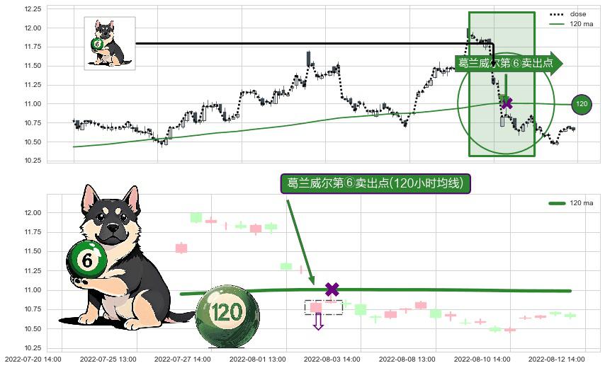 ⚀ 2022-08-02 13:00:00-小时显现 葛兰威尔均线 120小时均线 第⑥卖出点 走势反转见顶信号,后市看跌,卖出信号