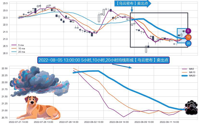 ⚀ 2022-07-28 13:00:00小时-2022-08-12 14:00:00小时显现 5小时-10小时-20小时均线 【乌云密布】卖出点 看空信号,后市看跌,卖出