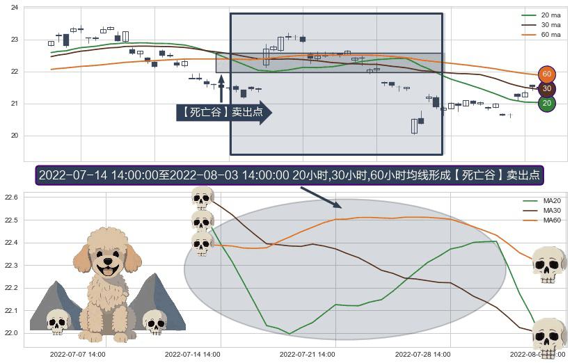 ⚀ 2022-07-15 13:00:00-小时至2022-08-03 14:00:00-小时显现 20小时-30小时-60小时均线 【死亡谷】卖出点 看空信号,后市看跌,卖出