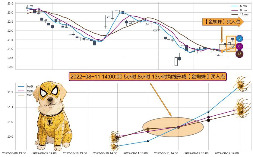 ⚀ 2022-08-11 14:00:00小时显现 5小时-8小时-13小时均线 【金蜘蛛】买入点 看多信号,后市看涨,买入
