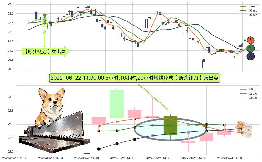 ⚀ 2022-06-22 14:00:00小时显现 5小时-10小时-20小时均线 【断头铡刀】卖出点 看空信号,后市看跌,卖出