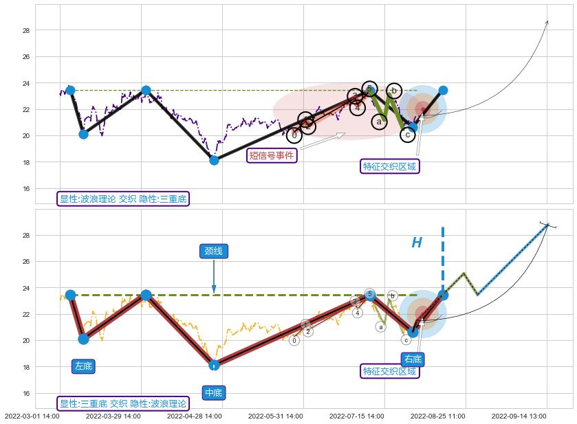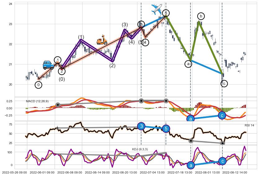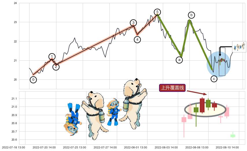 从2022-07-20 14:00至2022-08-02 14:00,共包含19个小时,阶段股价下跌-12.40%,阶段股价变动位移路程比: 1 : 1.2,2022-08-02 13:00向↘︎形成缺口,跳空下跌-4.60%˚